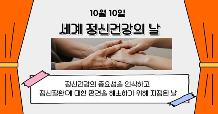 ÀÌÈÄ Á¤½Å°Ç°ÀÇ ³¯ ¼Ò°³¸¦ ÅëÇØ 10¿ù 10ÀÏÀÌ ¼¼°è Á¤½Å°Ç°ÀÇ ³¯·Î ÁöÁ¤µÈ ¹è°æ°ú ÃëÁö¸¦ ¾È³»ÇÏ¿´½À´Ï´Ù. Á¤½Å°Ç°ÀÇ Á߿伺°ú ´õºÒ¾î, Á¤½ÅÁúȯ¿¡ ´ëÇÑ »çȸÀû Æí°ßÀ» ÁÙÀ̱â À§ÇÑ ÀÇ¹Ì ÀÖ´Â ³¯ÀÓÀ» ÇÔ²² °øÀ¯Çϸç Çà»çÀÇ ÃëÁö¸¦ ´Ù½Ã ÇÑ ¹ø µÇ»õ±â´Â ½Ã°£À» °¡Á³½À´Ï´Ù.